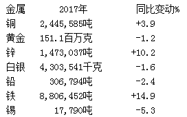 以下為秘魯能源和礦業部公布的該國2017年全年礦物產出數據: