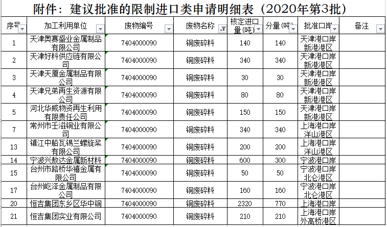 昨日,2020年第三批廢銅、廢鋁、廢鋼鐵批文公布。其中,廢銅核定進口量總計4620噸,廢鋁核定進口量總計1440噸,廢鋼鐵核定進口量2670噸。