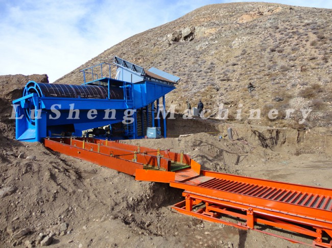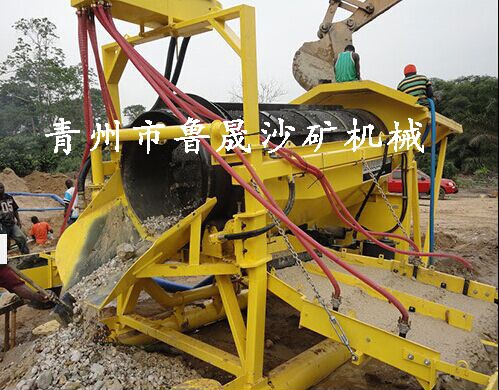 砂金洗礦機(jī)利用旋轉(zhuǎn)的圓筒和內(nèi)部的刮板以及物料中自有的卵石和巖石來(lái)分解粘土,塊狀物和軟氧化物。洗礦機(jī)的圓筒慢慢地旋轉(zhuǎn),類(lèi)似于一個(gè)巨大的洗衣機(jī)。粗細(xì)不同的物料還有水同時(shí)在一起翻滾攪動(dòng),有效地把有用礦物從泥性土壤,粘土中釋放出來(lái).分散均勻后漿狀般的物料被圓筒送到尾端,并從溢流口排到錐形篩進(jìn)行篩分.錐形篩把大粒度且無(wú)價(jià)值的物料排除,篩下的礦漿即可直接進(jìn)入各種選礦設(shè)備,如水套離心機(jī),鼓動(dòng)溜槽,蠕動(dòng)溜槽,自動(dòng)選金機(jī)等。